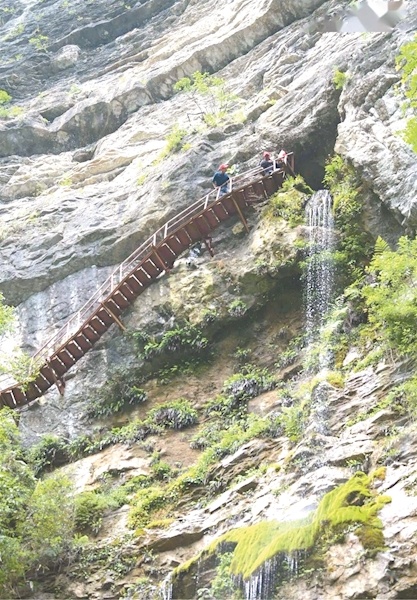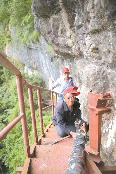 当年,施工人员用钢管在绝壁上架起了100余米长的栈道“天路”,并沿栈道铺设水管,将绝壁上的清泉引到山间小道上,又沿着2公里多的羊肠小道,一路铺设水管至村中,汩汩清泉便沿着这碗口粗的水管流入了201户村民家中。