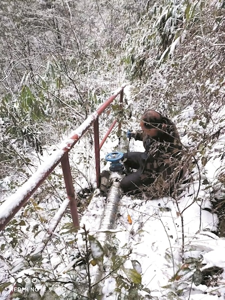 2022年初,二等岩村大雪封山,严寒冻裂了输水管道,致使供水中断。得知消息后,护水队员们冒雪上山抢修,道路陡峭崎岖,雪后十分光滑危险。他们在雪中缓慢攀爬,清理10多处树障,及时修好了水管,深夜12点才从悬崖绝壁上摸黑下山。