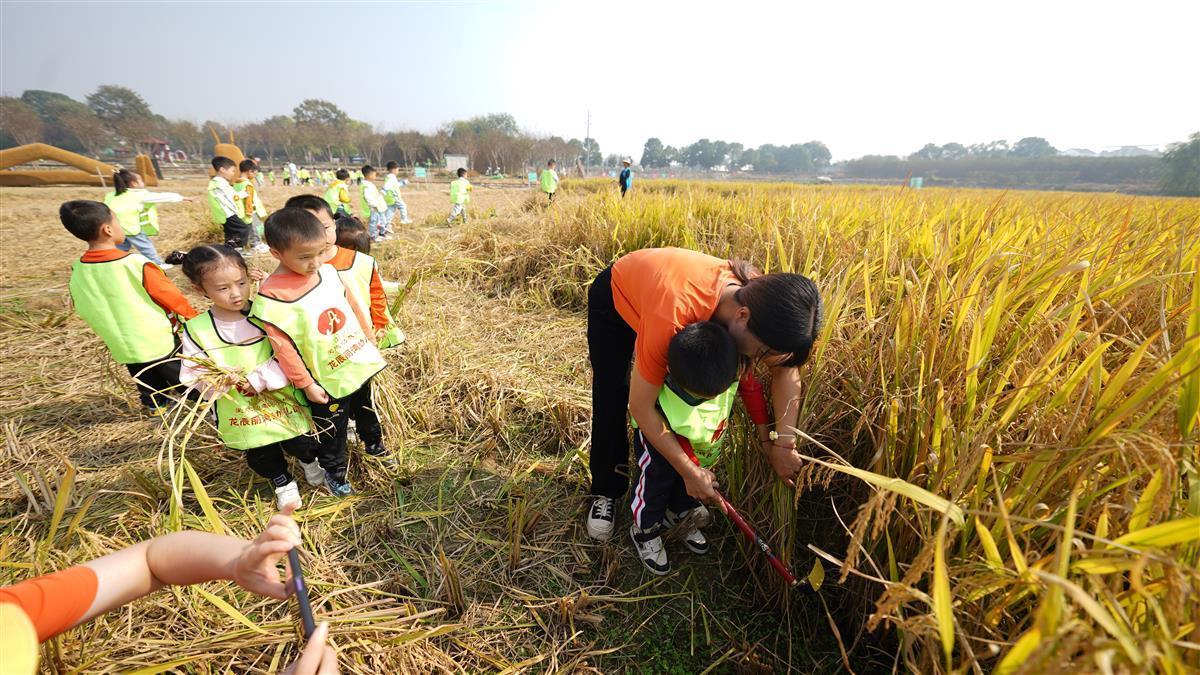 孩子们在“稻田拾秋”课堂上体验割稻谷