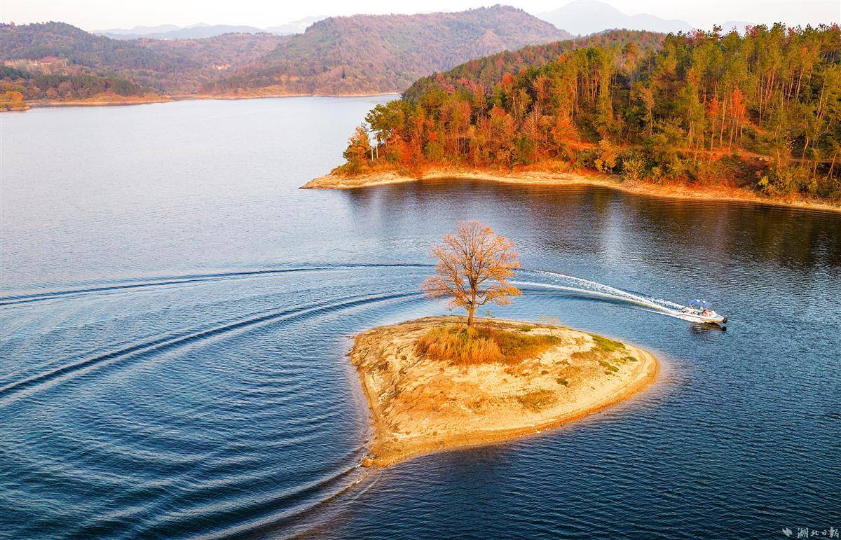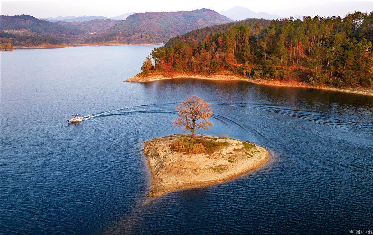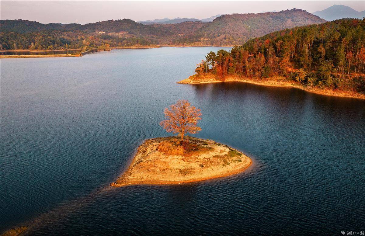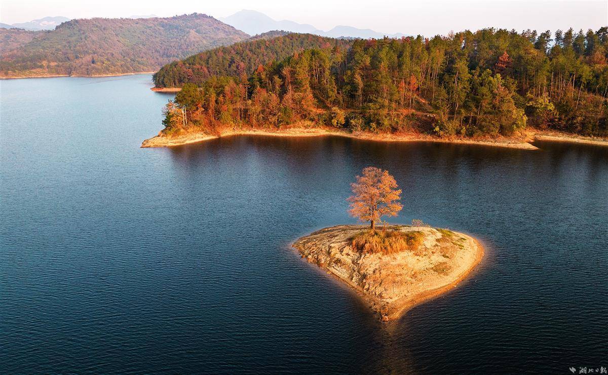 11月14日,深秋初冬虽然寒冷,但武汉新洲区道观河水库的“心”形小岛上一棵乌桕树,在夕阳下显得更加火红。