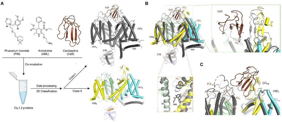 无论是自由形式,还是与黑曼巴蛇毒素calciseptine、氨氯地平,胺碘酮与索非布韦结合,Ca1.2通道都呈现出一致的失活构象。在解析多种药物调控Ca1.2作用机制的过程中,作者获得了三个重要的非预期发现: