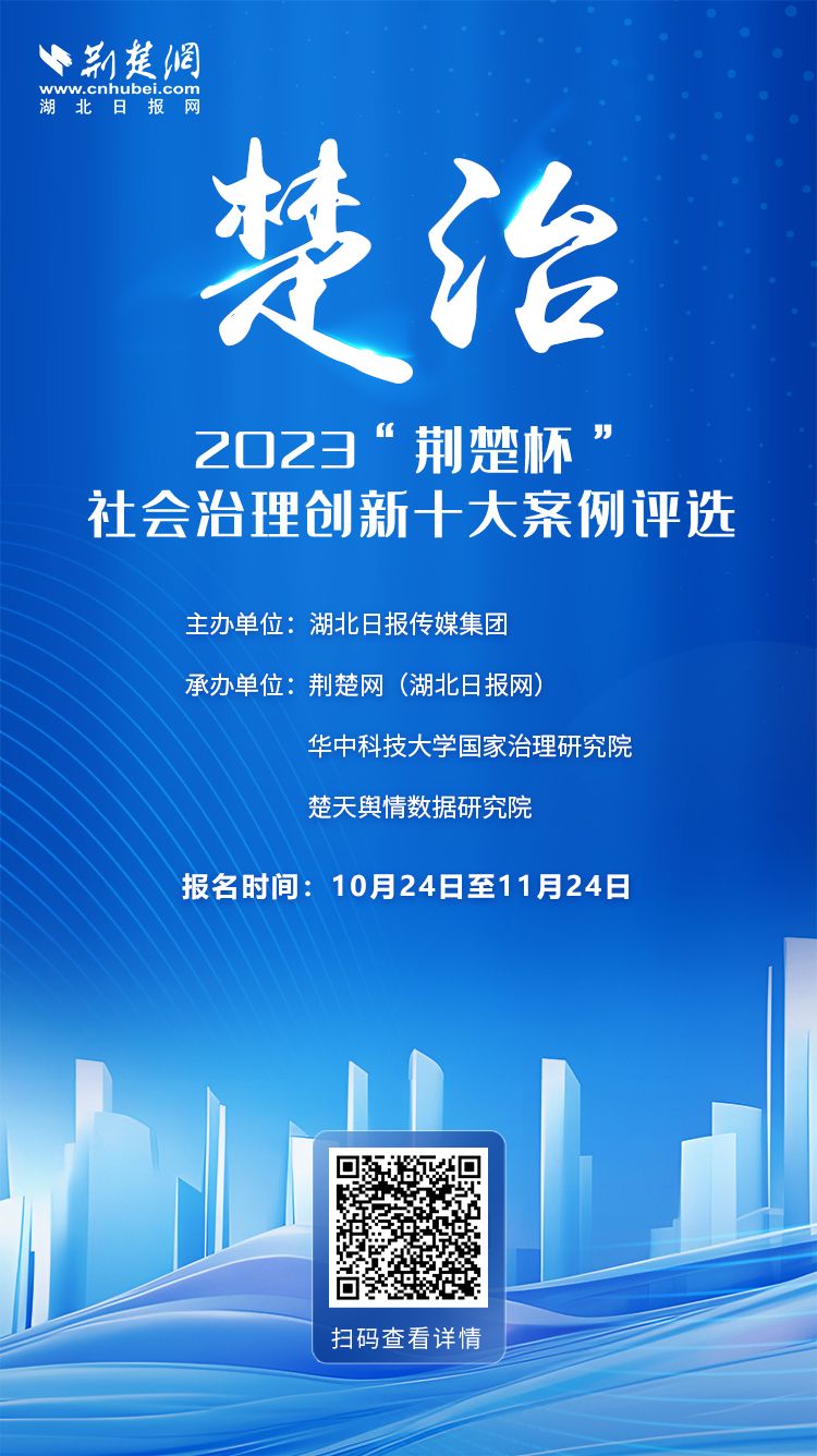 “楚治——2023‘荆楚杯’社会治理创新十大案例”评选活动由湖北日报传媒集团主办,荆楚网(湖北日报网)、华中科技大学国家治理研究院联合楚天舆情数据研究院承办,旨在发现我省社会治理创新的先进典型,分享社会治理创新的先进经验,探索社会治理创新规律,助推社会治理创新实践,助力提高社会治理水平。活动报名时间为10月24日至11月24日,欢迎省直、市州、县区等各级党政机关、企事业单位报名参评。