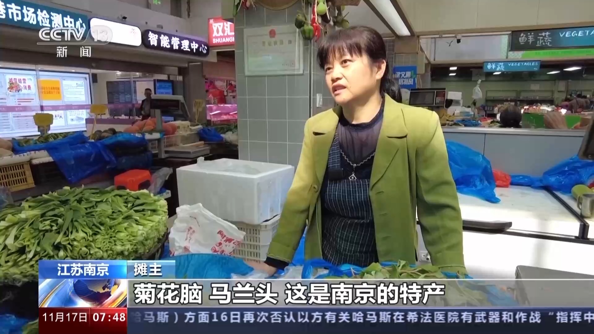 摊主:有的游客来玩就顺便带点蔬菜回去,到我们菜场里面买,觉得有些菜价格比他们那边还便宜点。菊花脑、马兰头这是南京的特产。