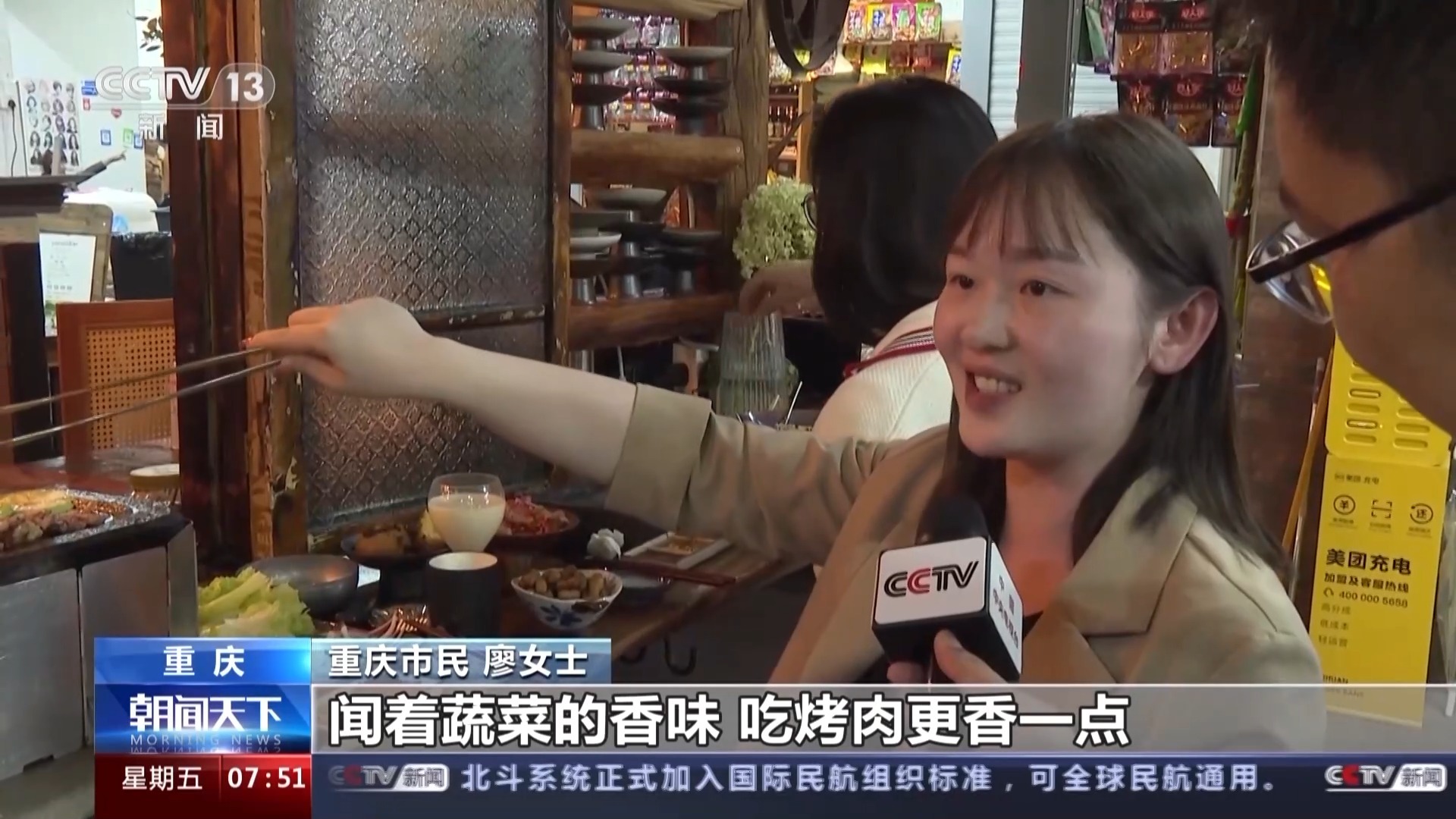 重庆市民 廖女士:觉得很新奇,在菜市场里面吃烤肉,闻着蔬菜的香味,吃烤肉更香一点。