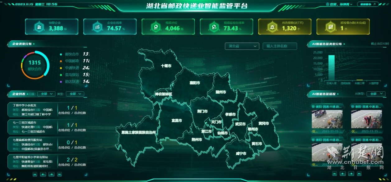 荆楚网(湖北日报网)讯(通讯员 杨易云 王丹丹)11月17日,在湖北省邮政管理局监管大屏幕上,所有快递网点的实时画面一目了然。“这是中国电信打造的天翼视联网‘邮政快递业智能监管平台’, 它实现了对全省邮政快递行业的视频联网全覆盖。”