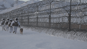 边防官兵和军犬的身影
