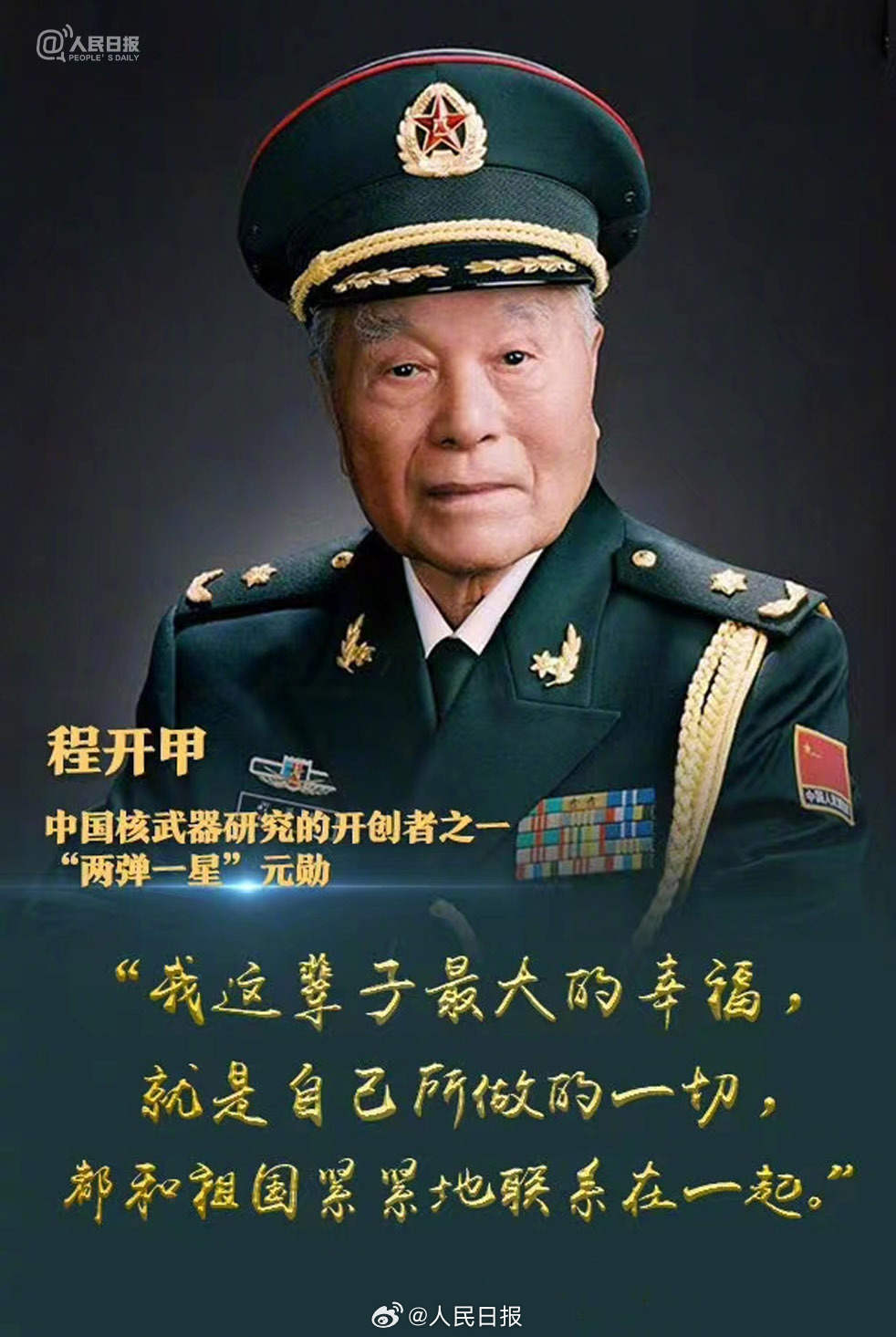 1964年10月16日,东方一声巨响,罗布泊升起的蘑菇云震惊世界。从参与原子弹研制,到参与主持决策核试验,程开甲倾注了全部心血和才智。坚守大漠20余年,程开甲的名字曾被列国家绝密档案。今天,程开甲逝世5年了,缅怀,致敬!