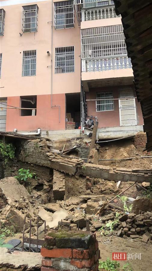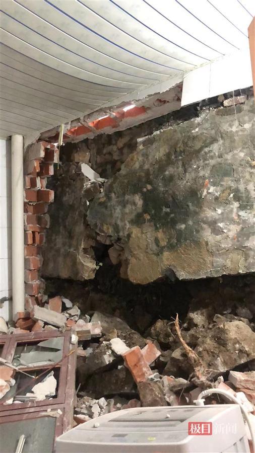 17日中午1时许,极目新闻记者来到该小区。发现出事的居民楼位于蕲春三中对面,高七层,一共三个单元。记者从B单元中间一位居民家后门进屋,穿过客厅,发现楼前门外挡土墙已崩塌,砖头、木片以及大块大块的水泥板四处散落,还有更大的水泥块已与上面的墙体间产生裂缝,随时将有下落可能。
