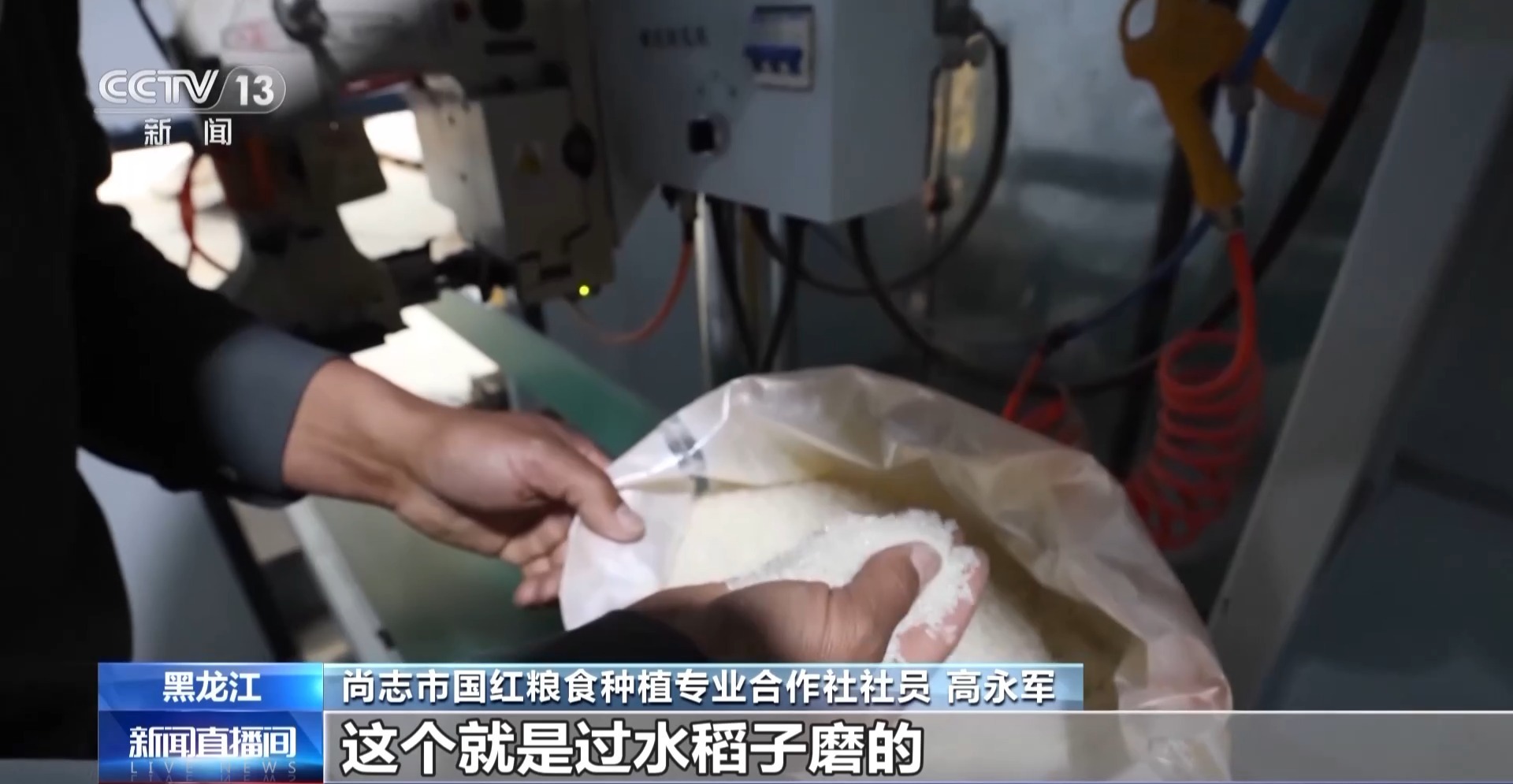 尚志市国红粮食种植专业合作社社员 高永军:这个是刚磨出来的米,这就是过水稻子磨的,今年的过水稻子还行。
