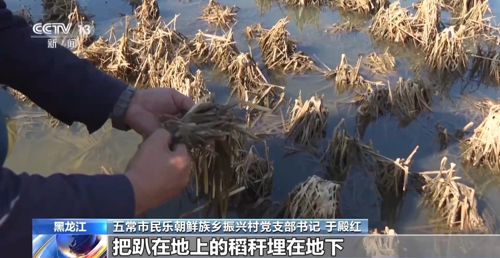 五常市民乐朝鲜族乡振兴村党支部书记 于殿红:这块地块地势比较洼,水来得急,而且水上得特别深,原来挺高的稻秆,现在经过长时间的水泡已经趴在地上了。所以我们现在就马上进行秋翻,把趴在地上的稻秆埋在地下,让它起到肥的作用。