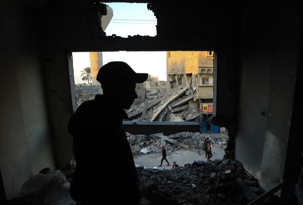 11月17日,在加沙地带南部城市汗尤尼斯,一名男子查看遭以色列袭击后的建筑废墟。新华社发(里泽克·阿卜杜勒贾瓦德摄)