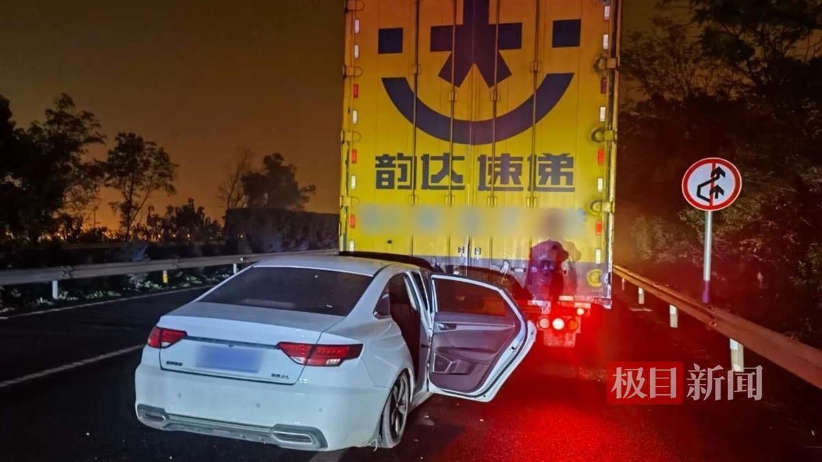 这辆轿车的行车记录仪视频显示,11月9日深夜,该车行驶在沪渝高速918KM蔡甸路段往上海方向,道路前方行驶着一辆运送快递的半挂大货车,轿车没有任何减速的迹象,猛烈撞上大货车尾部,半截车头插进货车车底。万幸的是,轿车驾驶员杨某和坐在副驾驶的男子均无大碍。