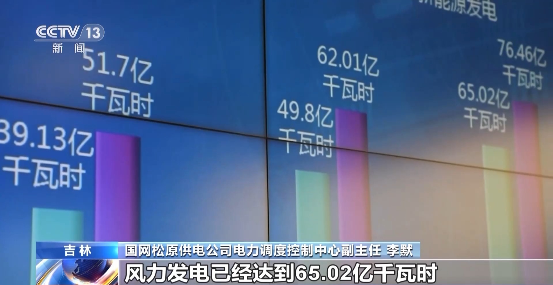 国网松原供电公司电力调度控制中心副主任 李默:现在很明显,风力发电增长的速度是非常快的,到2022年就是49.8亿千瓦时了。而截至目前,到(今年)10月风力发电已经达到65.02亿千瓦时。整个辖区的变电站是53座,新能源的装机容量占比已经在84%左右了。清洁能源的投入确实会帮助火电或热电,减少它的投入数量,减少煤炭、化石燃料的消纳。