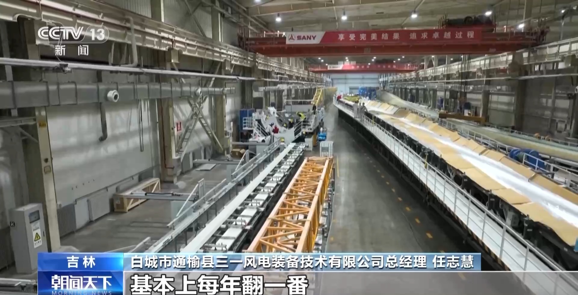 白城市通榆县三一风电装备技术有限公司总经理 任志慧:2022年我们(产值)达到20.6个亿,基本上每年翻一番。我们通榆工厂现有订单基本覆盖到了明年的年末。