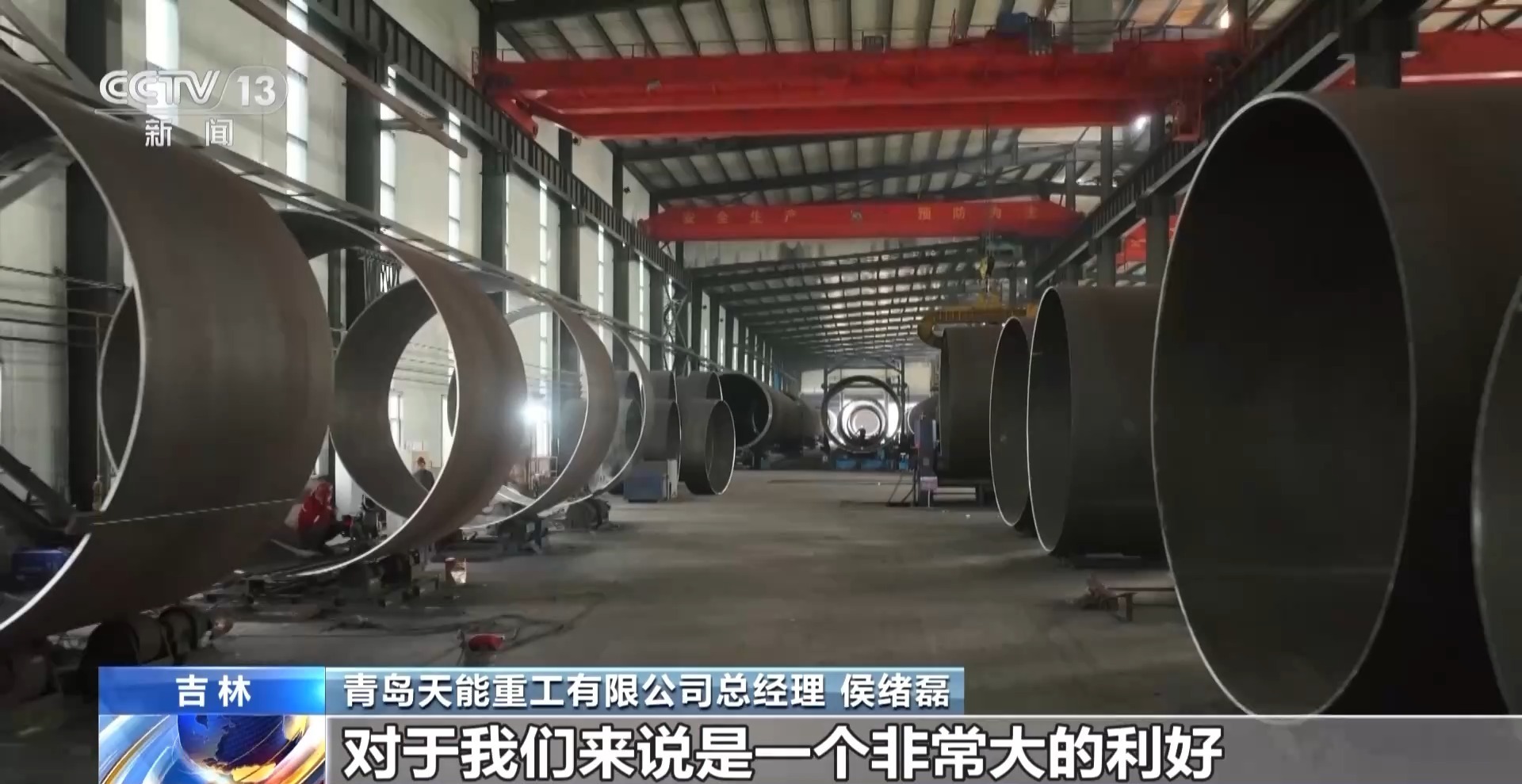 青岛天能重工有限公司总经理 侯绪磊:风电产业的不断发展,对于我们是一个非常大的利好。今年我们又扩大了混塔生产线,对于我们来说,我们非常看好这个市场。