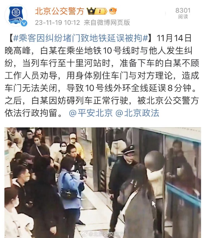 据北京公交警方11月19日通报,一名乘客在地铁10号线上因纠纷堵门,导致10号线外环全线延误8分钟,目前已被行政拘留。