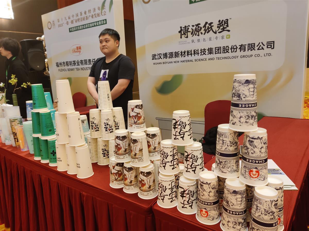 在武汉博源新材料科技集团股份有限公司的展位上,不同材质和规格的茶饮包装杯被倒扣在桌上,有的设计新潮大胆,有的设计古色古香。摊位负责人林斌介绍,他是第一次来赤壁,第一次品尝到赤壁青砖奶茶,感觉茶味浓郁,很有特色。今天至少已有20余人交换了联系方式,对他来说不仅是一次潮饮大会,也是一次招商大会。