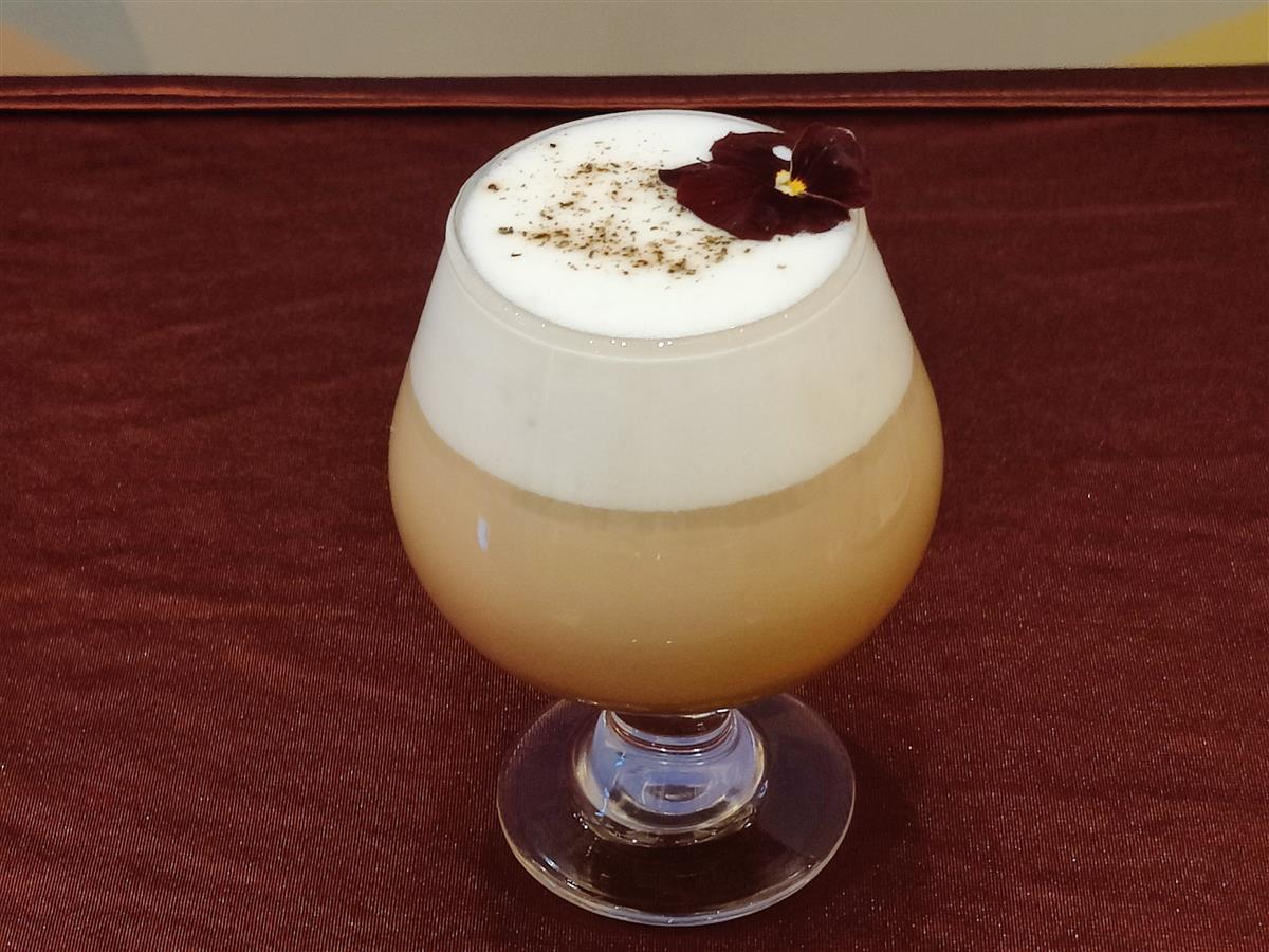 7号代表队带来的作品《白露横江》获得大赛特等奖。据创作者代表陆昌琪介绍,“白露横江”出自苏轼的《赤壁赋》,意思是白茫茫的雾气弥漫江面,与作品中椰云奶覆盖在青砖茶底上的视觉效果相呼应。这一款产品的口味灵感源于青砖茶煮制的蒙古奶茶,主打咸味,又创新性的加入甜酒风味,韵味悠长,最后配上柚子味的椰云顶,口感多元变化。