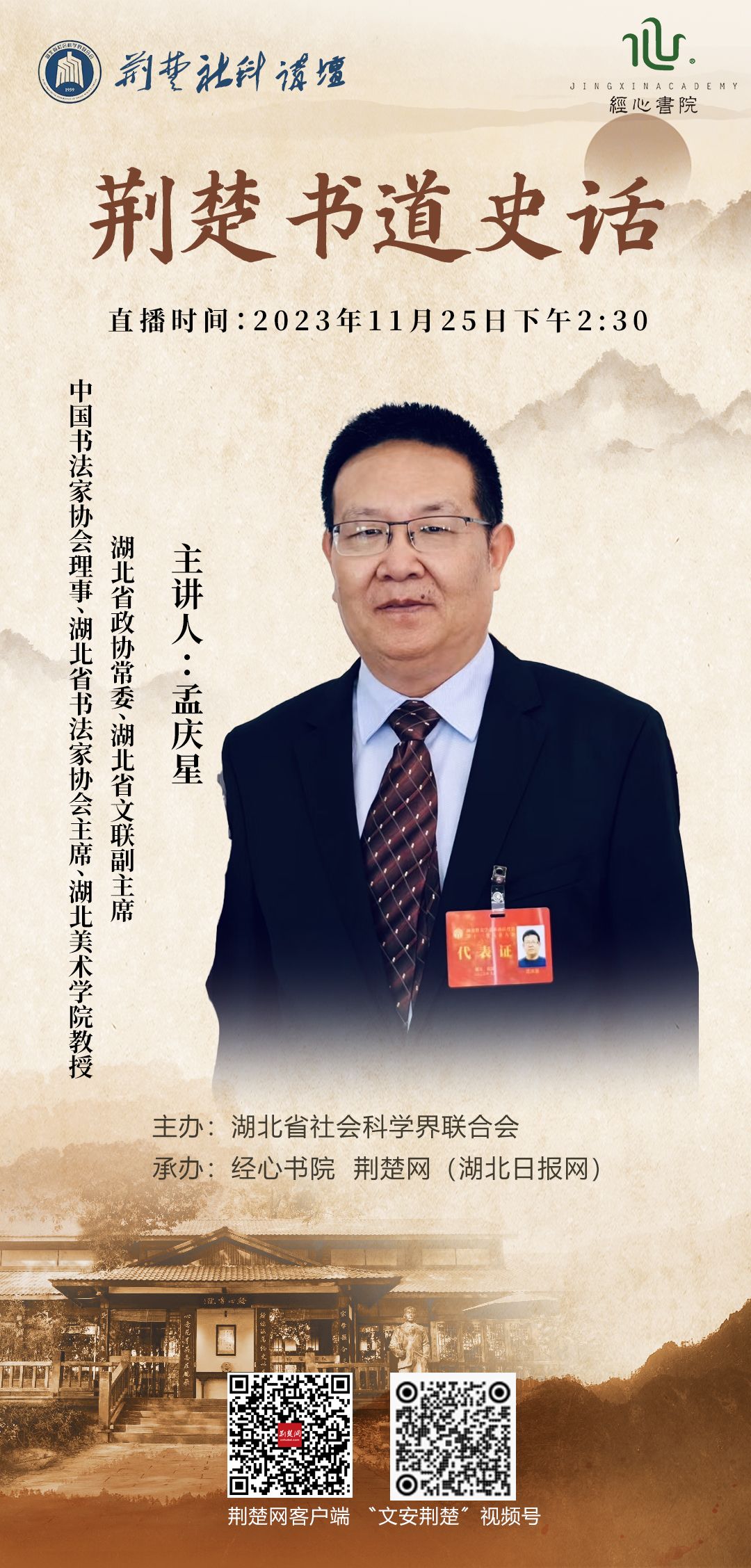 荆楚网(湖北日报网)讯(记者周婵、实习生姚婧)湖北历史悠久、人文荟萃,书法文化底蕴深厚、光彩夺目。11月25日下午2:30,2023“荆楚社科讲坛”邀请到湖北省文联副主席、湖北省书法家协会主席、湖北美术学院教授孟庆星来做客,与大家一同走进书法艺术的美妙世界,共赏荆楚书法风华。讲座将在东湖经心书院开展,讲座主题为《荆楚书道史话》,并同步进行网络直播,敬请关注。