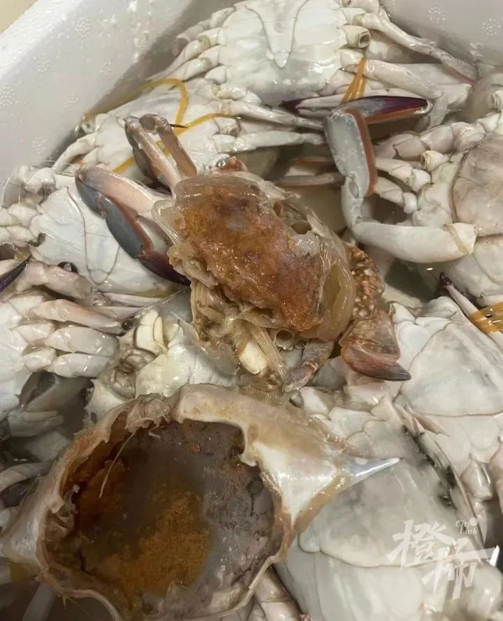 从图片中,记者看到,不少螃蟹出现了断脚,有几只螃蟹蟹壳有明显破损,甚至螃蟹腹部都是空的。