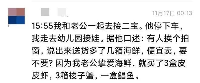 据这位市民口述,当时他停在路边等小孩放学,后面停了一辆货车,河南车牌。这时候有人敲窗户,说自己是远道而来上海送货的,海鲜多了几箱便宜卖,让他帮帮忙,而他刚好爱海鲜,于是就都“搬”回家了。
