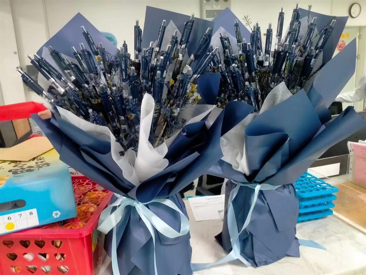 患者小夏说,来市肺科医院接受了蒋钰辉、姚利两位医生的手术治疗后,病情很快得到控制,但出院后,还需要服用一段时间的药物。因为自己的身体原因,药物副反应比较大,而来院就诊咨询又不方便,所以就频繁地给蒋医生发微信咨询。每次蒋医生都认真了解情况,并贴心地通过微信给出指导,就这样,她慢慢挺过了药物的不良反应期。现在,小夏已经康复,心里却始终记着蒋医生和姚医生的精湛医术,以及对她的热情服务。本想送点礼物表达感激,但被蒋医生和姚医生婉拒了。于是,她就咨询身边的同事,上网做“攻略”,咨询网友,什么样的礼物,医生无法拒绝。于是知道了,笔是医生的宝,便买了上百支笔,让花店帮忙包扎成两束“鲜花”的样子。