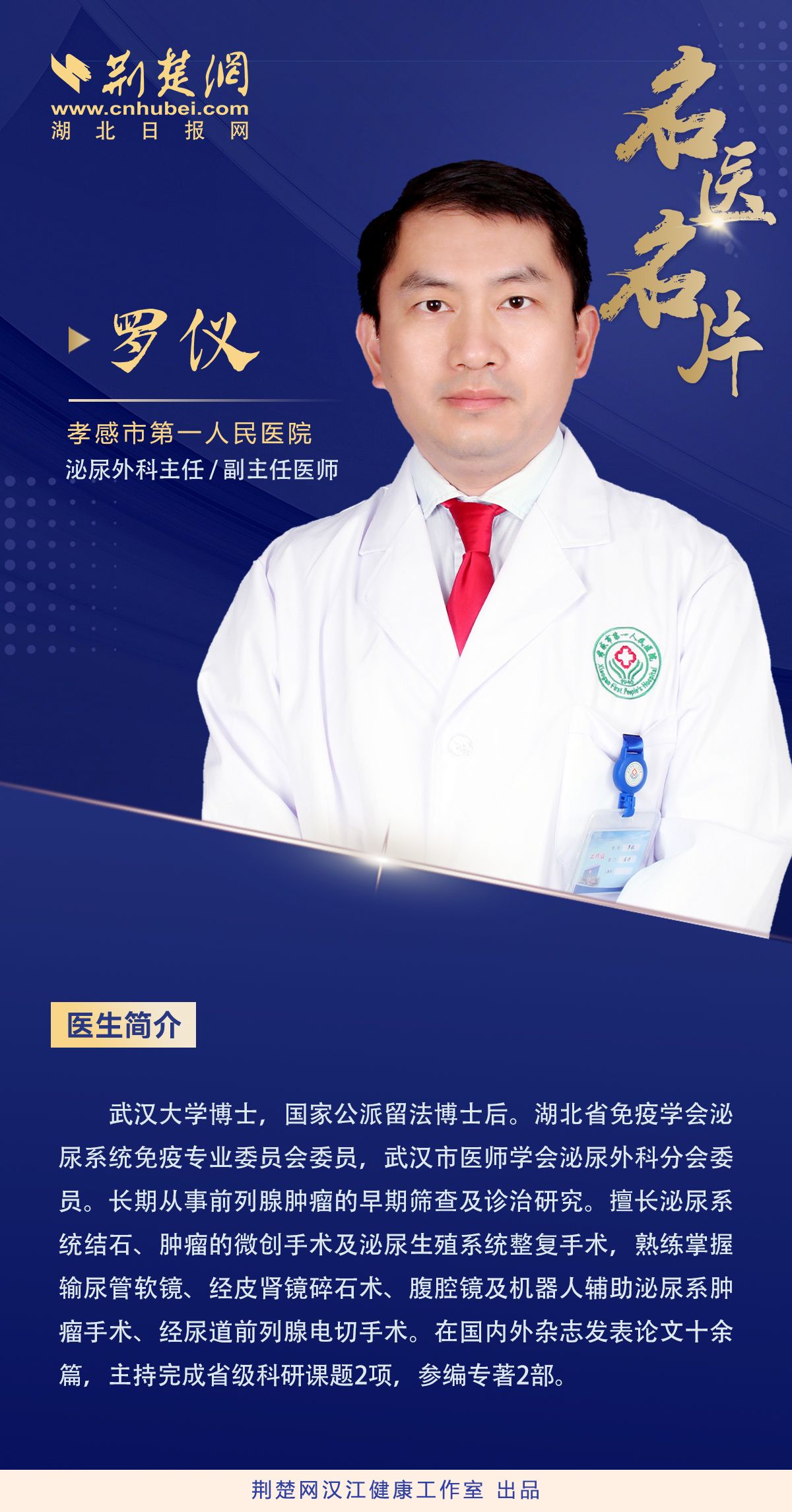 罗仪是孝感市第一人民医院泌尿外科主任,副主任医师。武汉大学博士,国家公派留法博士后。湖北省免疫学会泌尿系统免疫专业委员会委员,武汉市医师学会泌尿外科分会委员。
