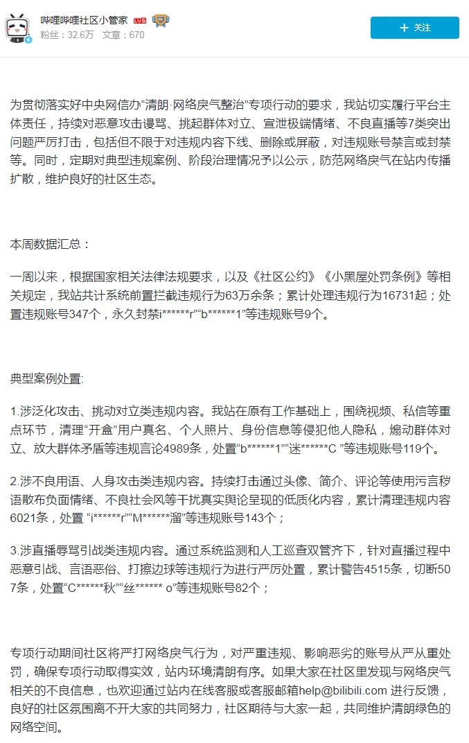 哔哩哔哩社区小管家也发布《哔哩哔哩关于“清朗·网络戾气整治”专项 的治理公告(1)》:累计处理违规行为16731起;处置违规账号347个,永久封禁i******r”“b******1”等违规账号9个。