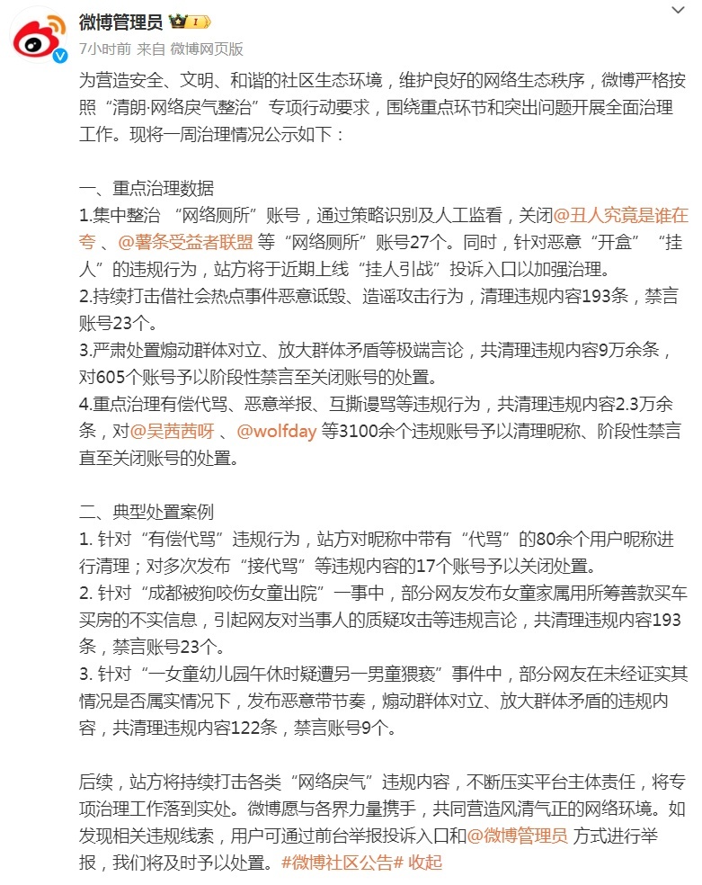 @微博管理员 21日消息:为营造安全、文明、和谐的社区生态环境,维护良好的网络生态秩序,微博严格按照“清朗·网络戾气整治”专项行动要求,围绕重点环节和突出问题开展全面治理工作。现将一周治理情况公示如下: