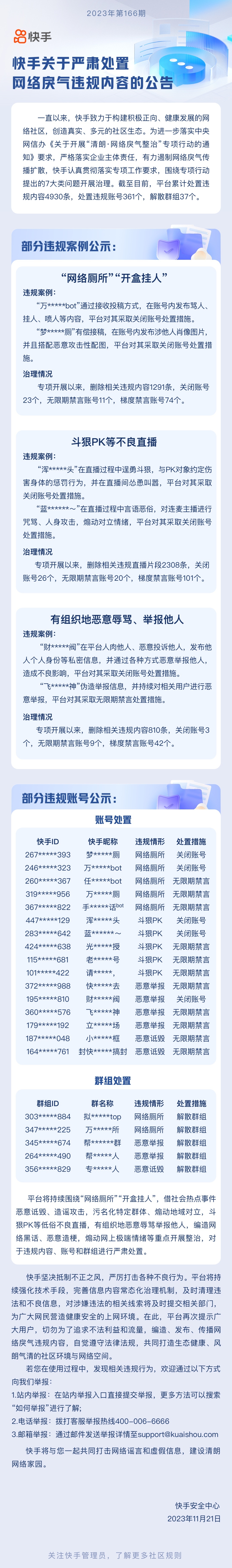 同日,快手公布治理“网络厕所”“开盒挂人”等行为,已处置违规账号361个。