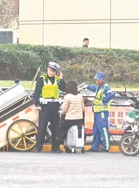 网传视频显示,在马路边上,一名女子坐在电动行李箱上,一手扶着把手和交警进行交涉。