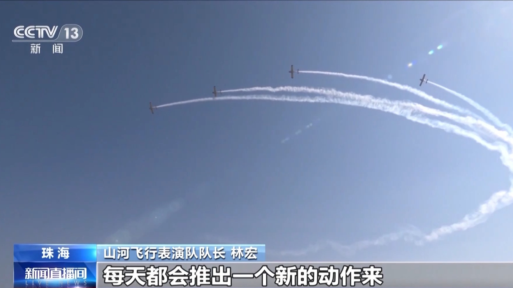 山河飞行表演队队长 林宏:自我感觉还算满意,纵队跟踪盘旋,螺旋式下降,包括横队开花是比较吸引眼球的,还是充分展现了阿若拉飞机的性能。每次飞行过后都会有一个讲评,争取一场比一场飞得好,每天都会推出一个新的动作来。