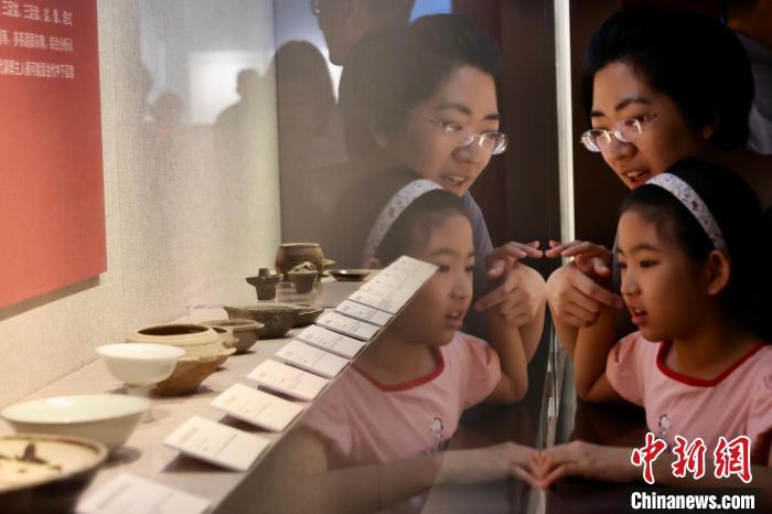 6月10日,“都城肇始——纪念北京建都870周年考古成果展”在北京考古遗址博物馆(金中都水关遗址)开幕。图为家长带着小朋友参观展览。 记者 易海菲 摄