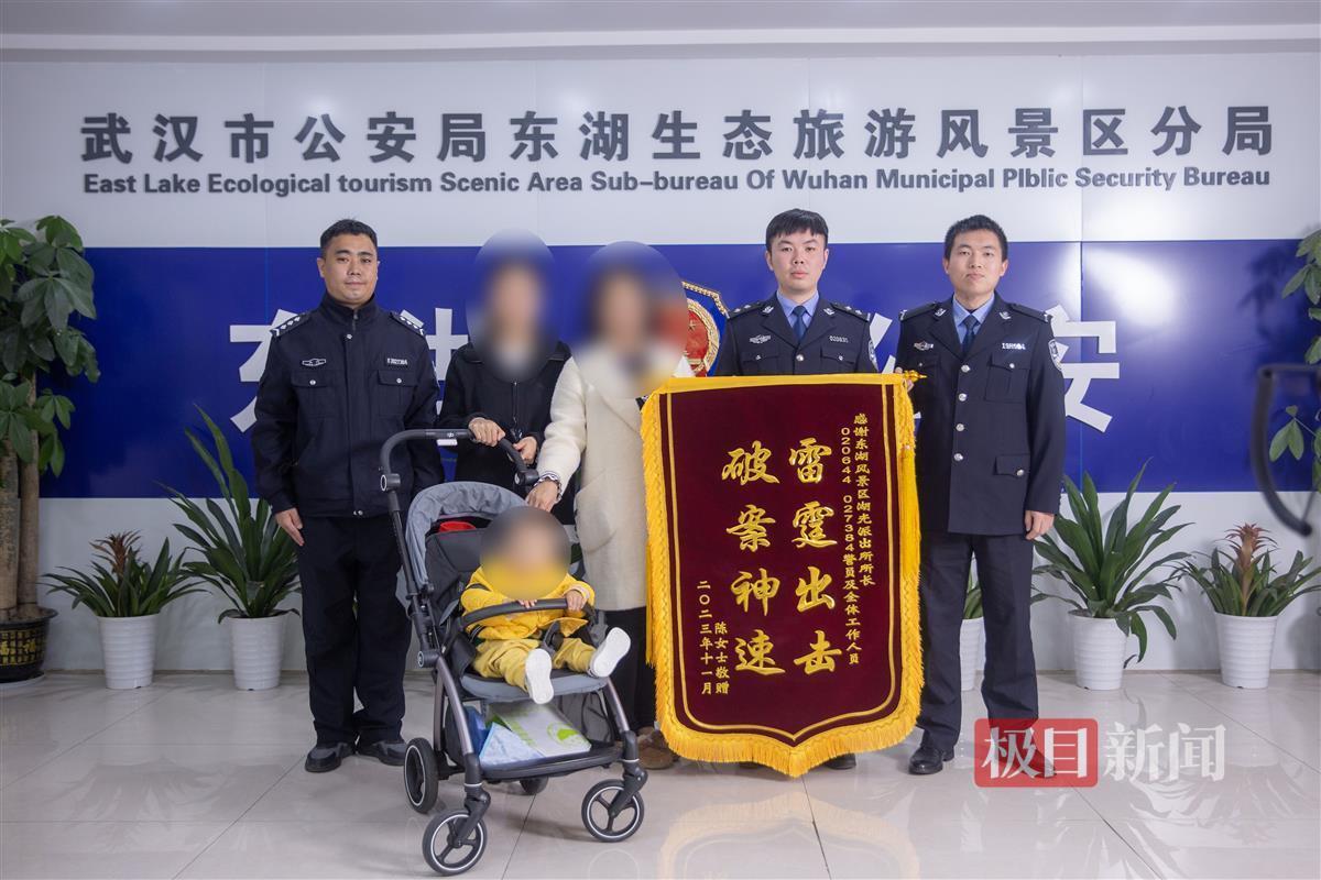 11月17日,胡女士推着一辆婴儿车来到湖风派出所,见到民警陈杨帆,赠送了一面印着“雷霆出击、破案神速”的锦旗。