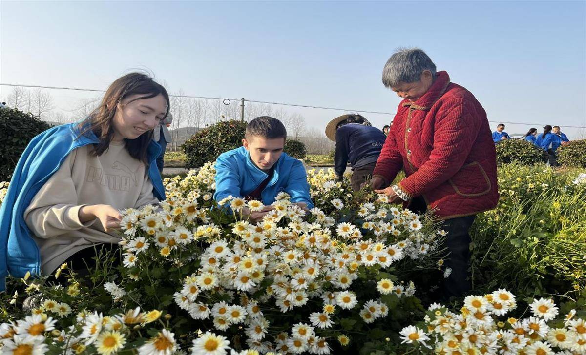 在堰头垸村的菊花种植基地,村民们正在忙碌地采摘菊花。在村民们的示范下,俄罗斯姑娘和小伙们用拇指和食指捻住菊花的杆,轻轻一掐,一朵朵鲜艳娇嫩的菊花便被成功摘下。不一会儿,大家就摘了满满一筐。