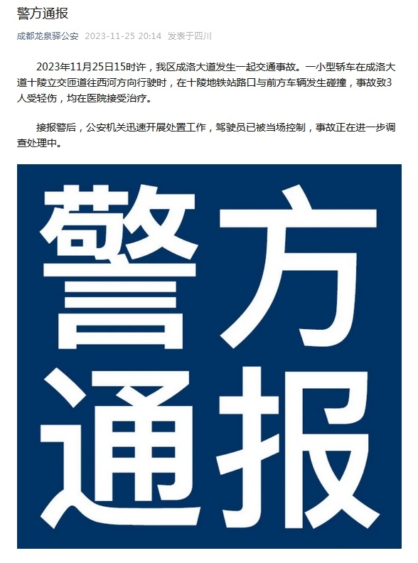 中新网11月26日电 据四川成都龙泉驿公安微信公众号消息,成都市公安局龙泉驿区分局25日发布一则警方通报称,2023年11月25日15时许,龙泉驿区成洛大道发生一起交通事故。一小型轿车在成洛大道十陵立交匝道往西河方向行驶时,在十陵地铁站路口与前方车辆发生碰撞,事故致3人受轻伤,均在医院接受治疗。接报警后,公安机关迅速开展处置工作,驾驶员已被当场控制,事故正在进一步调查处理中。