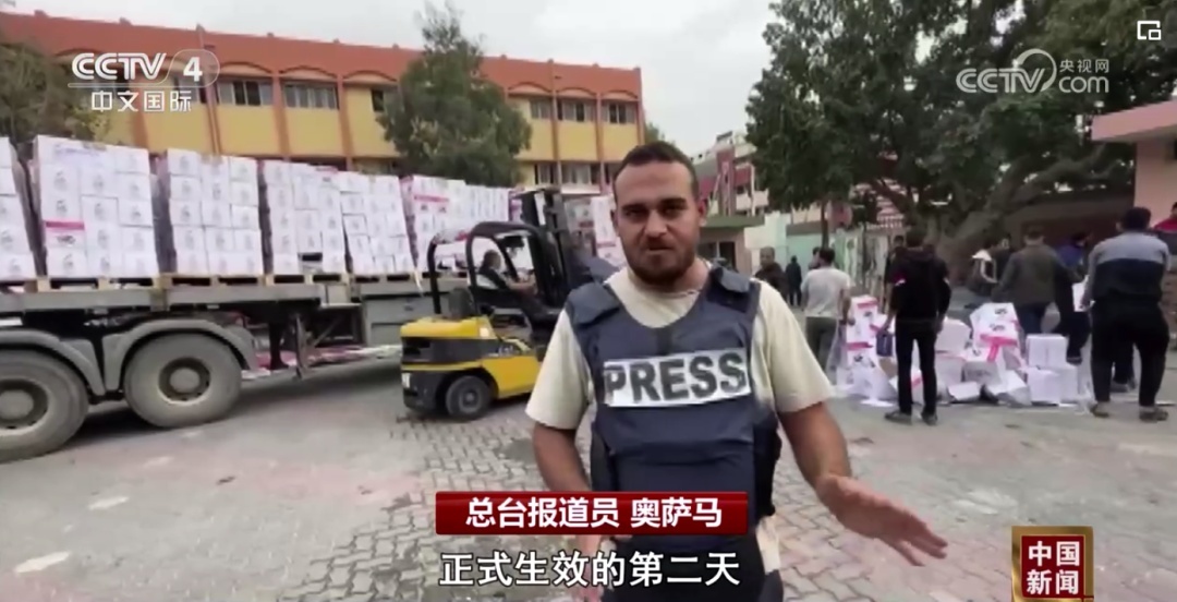 总台报道员 奥萨马:在加沙地带临时停火协议正式生效的第二天,首批运载救援物资的卡车抵达加沙城。现在看到的这些物资正在被运送到一个隶属于当地政府的学校仓库。