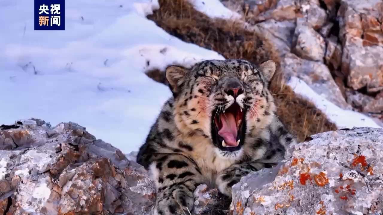 视频画面中,这只雪豹在山下捕猎到一只岩羊,进食完后,它爬到半山坡,趴在岩石上慵懒地打哈欠、享受着冬日暖阳,萌态十足。灰白色的毛皮,蓬松浓密,黑色的点斑清晰可见,甚至能感受到它的呼吸。