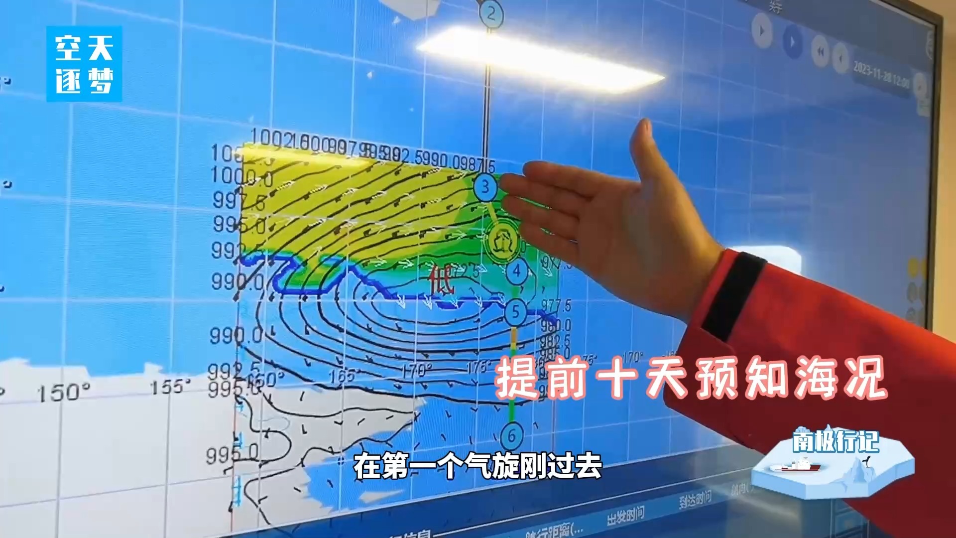随船气象员 李竞时:过了,过了,已经过了。现在我们已经到60度以南了,这个船载客户端这个软件,通过它可以叠加一个国内外的一个预报数据,然后在我们航行的过程中可以实时显示我们的目前的一个海况。像我们这个预报时效已经达到了十天目前是。第一个气旋刚过去,然后在它风浪减弱的一个区域,以及在第二个气旋还没有到,没有加强的时候,再提前穿过它。目前已经基本上完成之前的计划了。