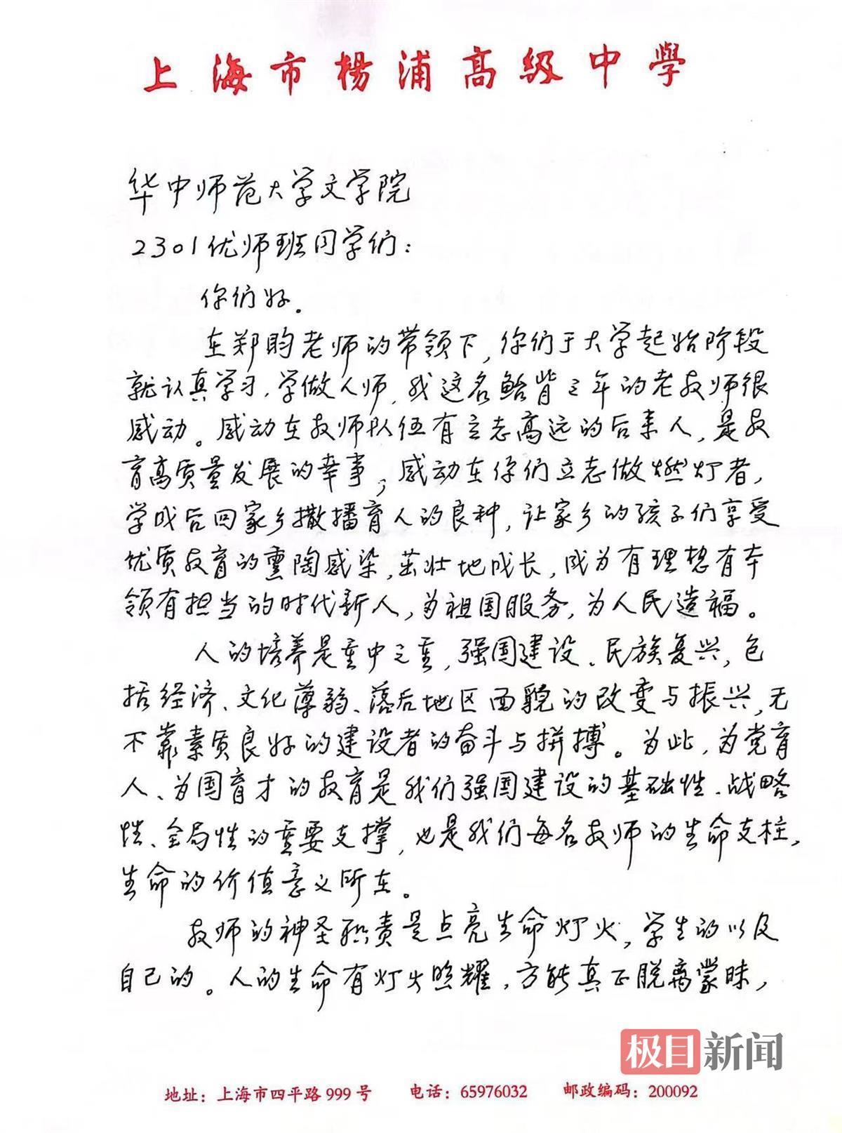 “于漪老师是我们中国教师最杰出的代表,作为一位90多岁的耄耋老人,亲笔写信勉励年轻学子,足以说明老人家对师范生培养的关心与寄予厚望。于漪老师深爱着学生,痴迷着语文教学,她一辈子都在教书、培养教师,她对我们年轻教师以及年轻学子的教导,尤其值得珍视。”华中师范大学文学院教授,博士生导师胡向东说。