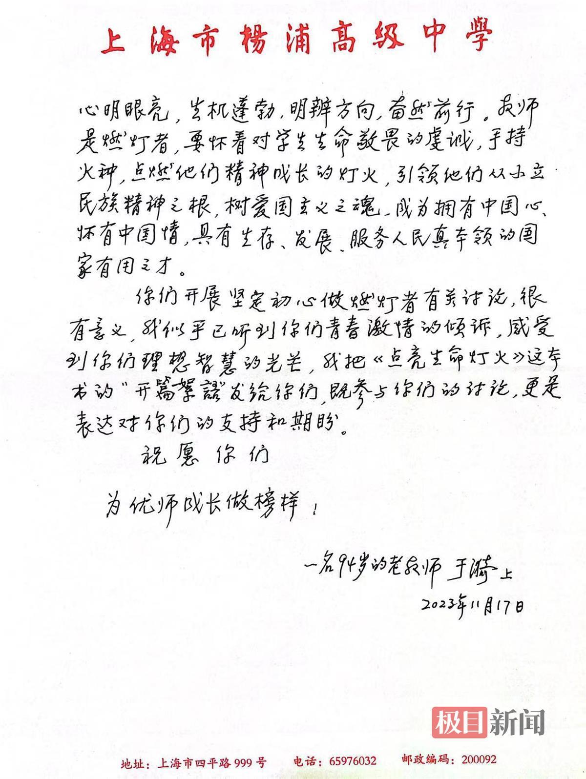 于漪老师在信中说,“‘为党育人、为国育才’的教育是我们强国建设的基础性、战略性、全局性的重要支撑。希望同学们点亮自己与学生的生命灯火,引领学生成为拥有中国心、怀有中国情,具有生存、发展、服务人民真本领的国家有用之才,为优师成长做榜样”。
