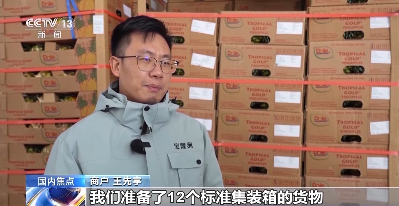 商户 王先宇:我们准备了12个标准集装箱的货物,品种包括菲律宾的凤梨、泰国的榴莲和龙眼,以及一部分国产的瓜类和一些水果甜玉米。