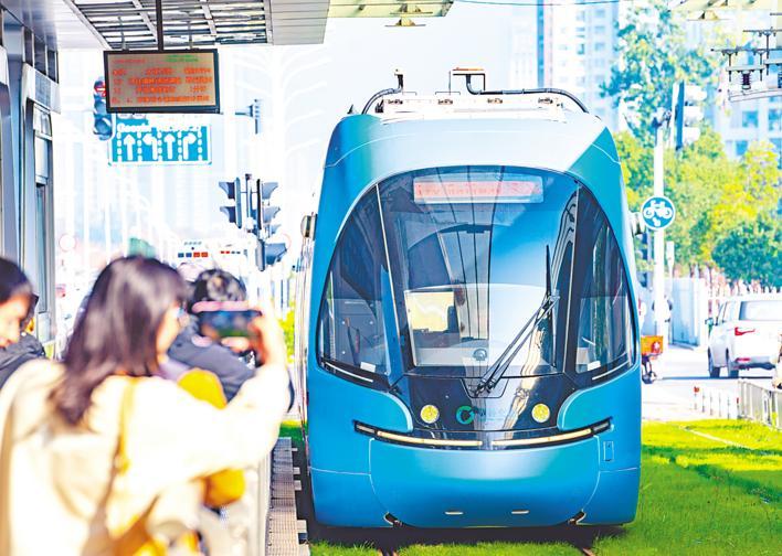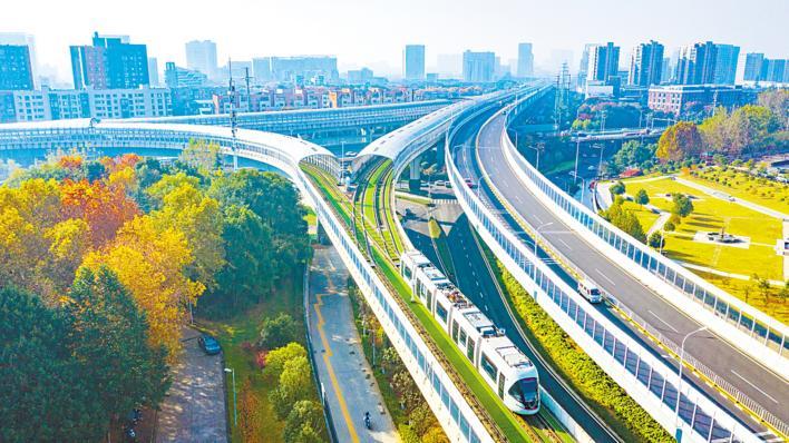 11月28日,一列“光谷量子号”有轨电车驶过三环线关山大道立交。当天,武汉光谷现代有轨电车L3线路开通试运营。L3线路北起华中大站、南至城铁汤逊湖站,共设15座车站。