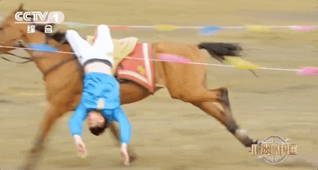 骑手在飞奔的马上倒挂金钩↓