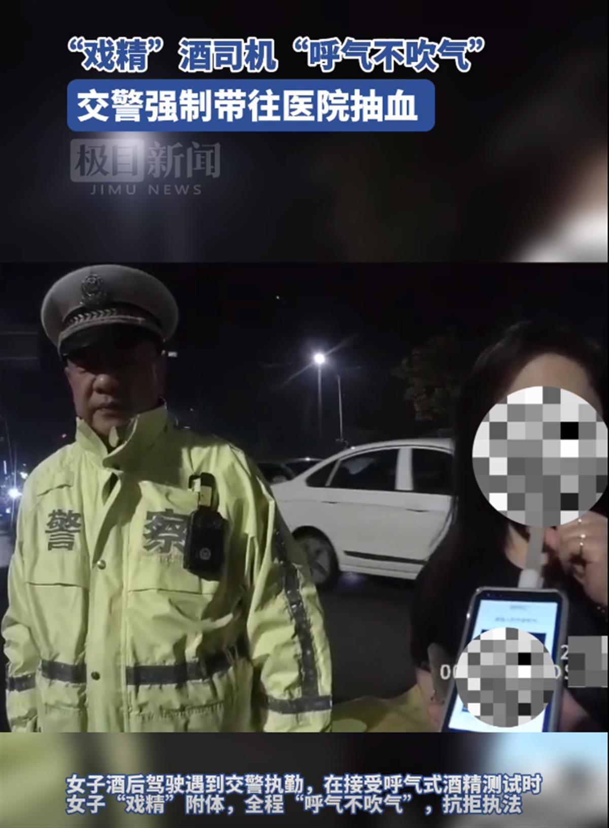 女子酒后驾驶遇到交警执勤,在接受呼气式酒精测试时,女子“戏精”附体,全程“呼气不吹气”,抗拒执法,最终,武汉江汉交警将女子带至医院进行强制抽血,结果已构成醉驾。