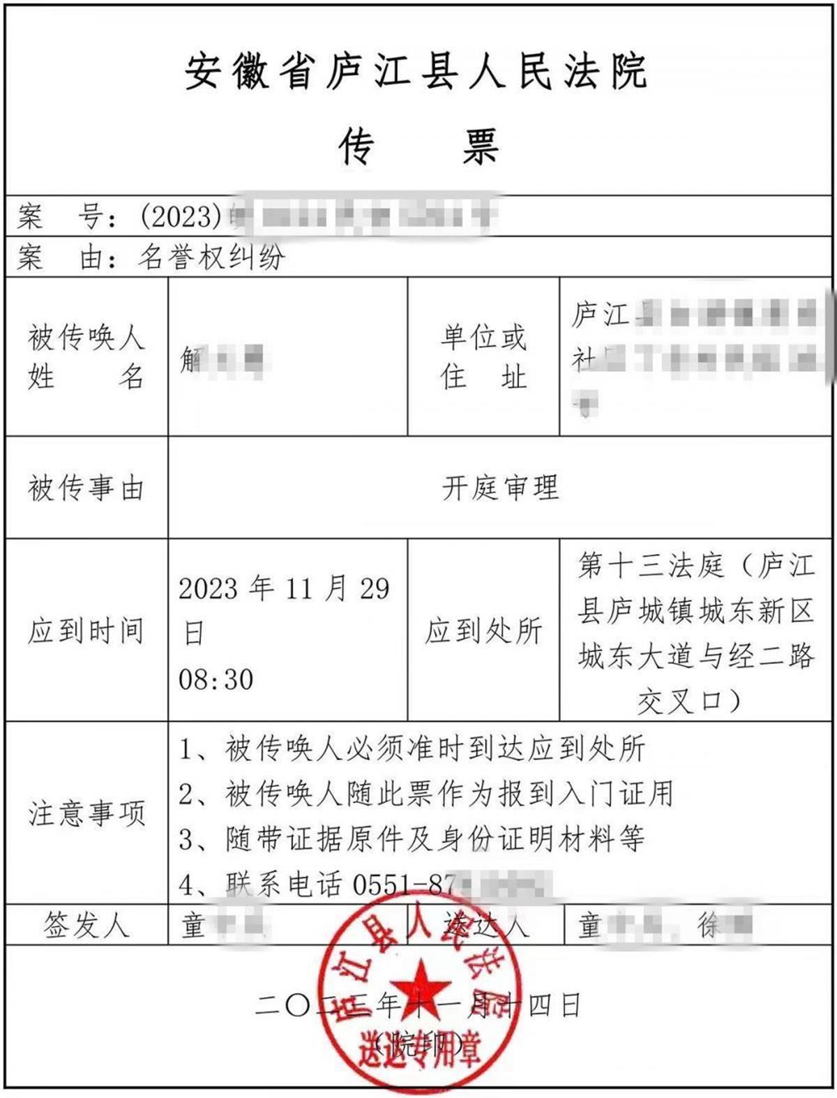 解女士收到的保姆女儿起诉她名誉侵权的法院传票(来源:受访者供图)