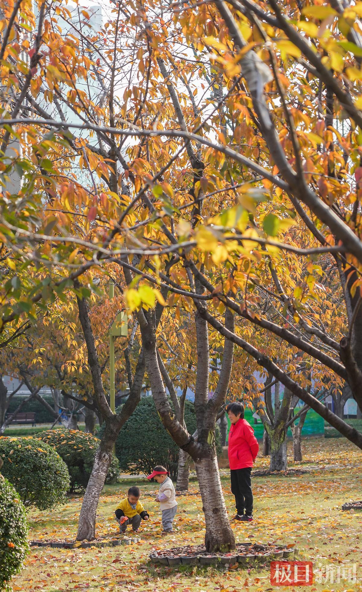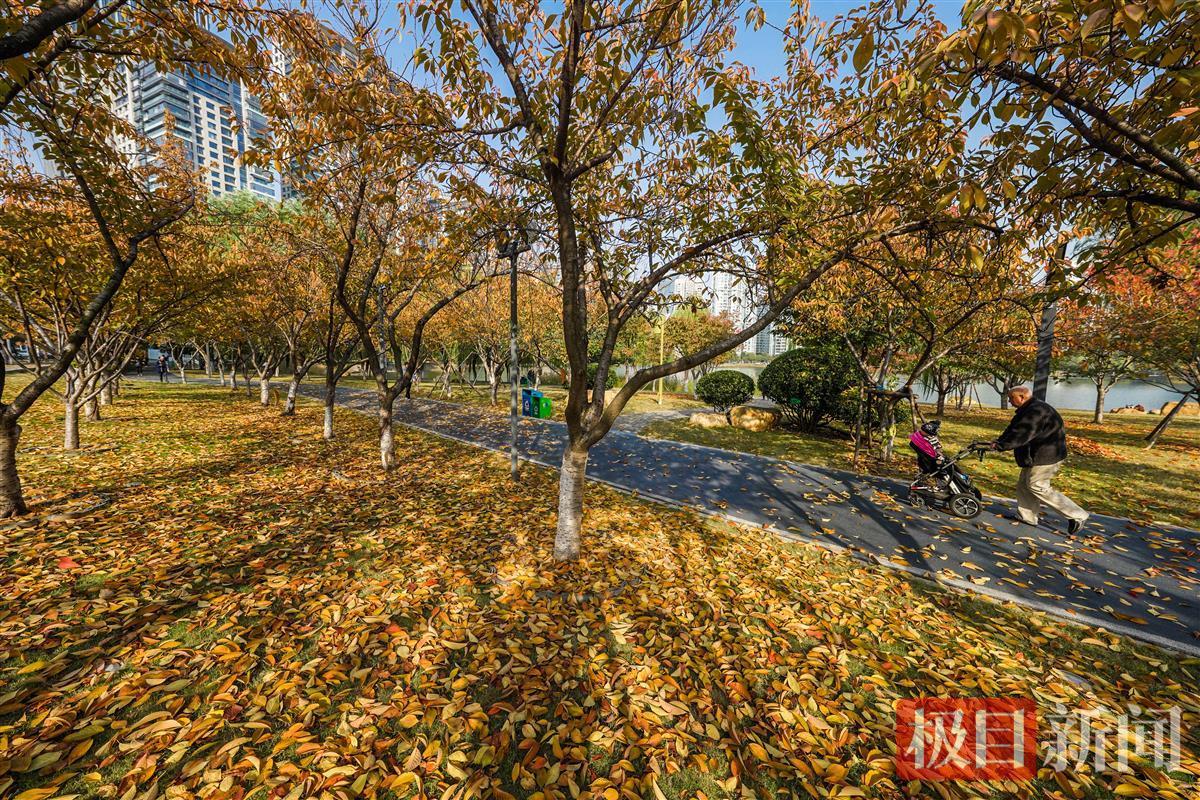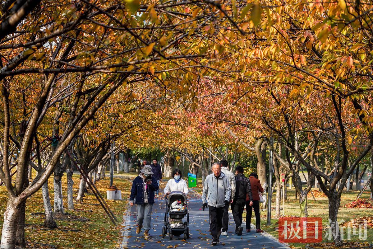11月29日,武汉市汉口西北湖公园已被斑斓的色彩包裹,小道两旁千余株樱树换上“冬装”,虽已看不到春季的簌簌繁花,但或黄或红的树叶爬满枝头,在晨光的沐浴下泛着耀眼的光,忽而风吹起,飘落一地金黄。