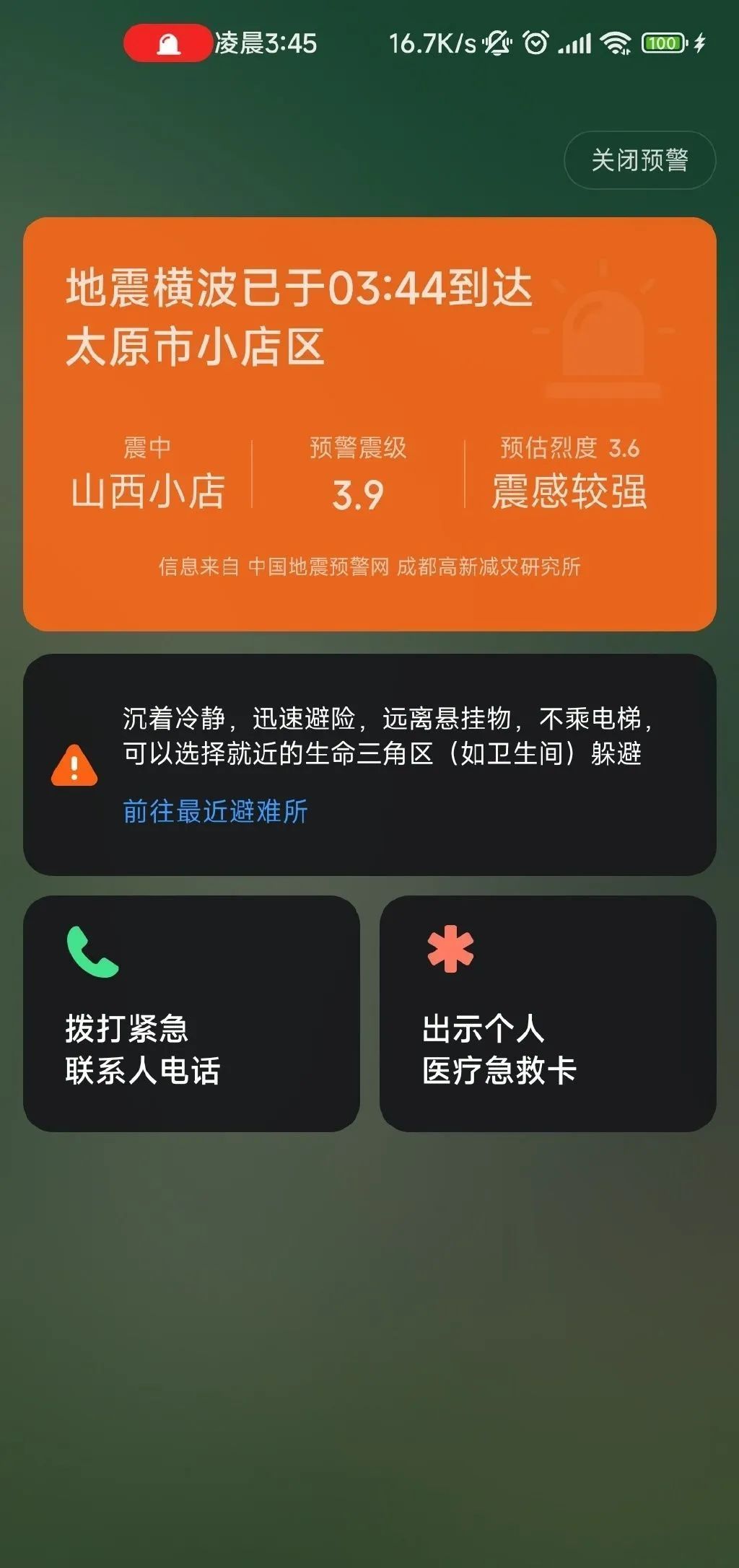 还有人说被手机提示给叫醒了,并配上收到的地震预警提示。