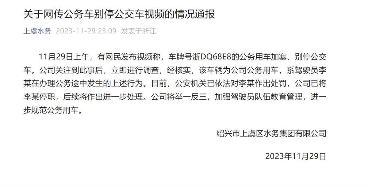 29日晚,绍兴市上虞区水务集团有限公司发布情况通报回应此事称,警方已做出处罚,公司已将涉事人员停职。(据11月30日大风新闻)