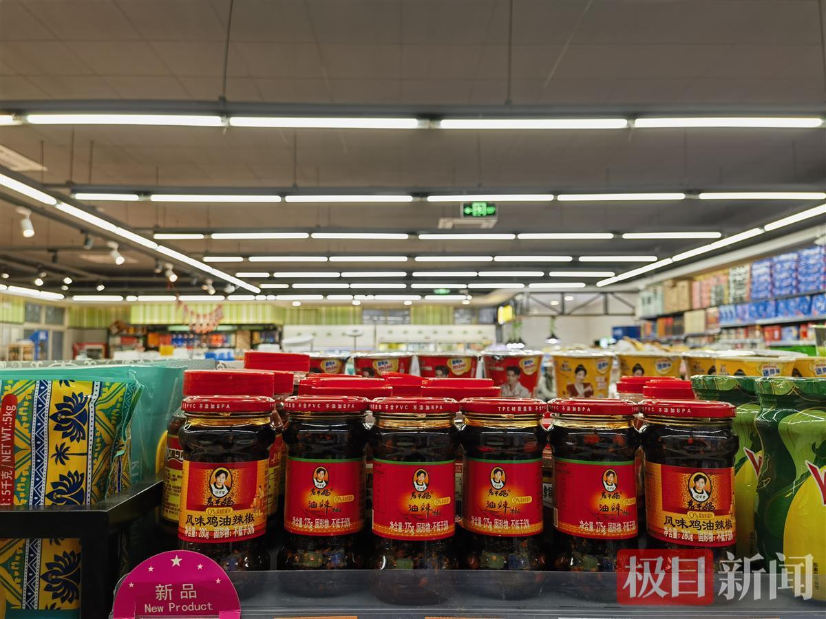 11月30日,极目新闻记者在中商徐东平价广场看到,货架上有老干妈、李锦记、南泉、味好美等多个辣酱品牌,老干妈的各类产品仍占据较大区域。超市工作人员表示,老干妈仍有一定消费群体,但是年轻消费者更偏爱买烧椒酱、剁椒酱等新口味的辣酱。